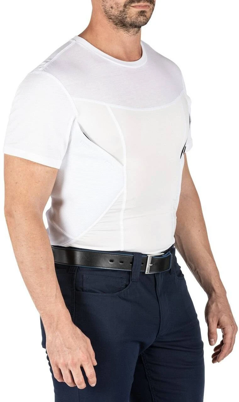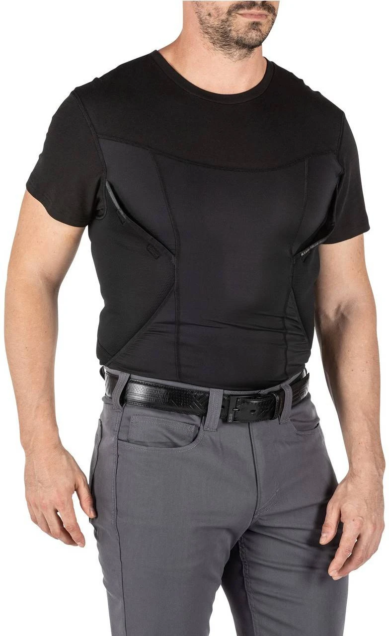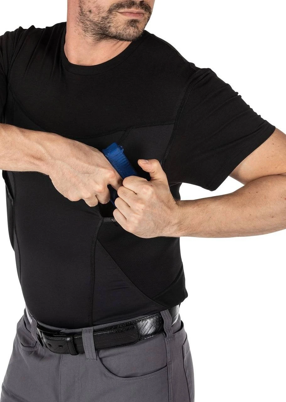 The 5.11 Tactical Cams Short Sleeve Baselayer Shirt is a great CCW alternative for those times when you don’t want to carry IWB or appendix-carry. The top of this baselayer looks like a typical t-shirt, making it perfect for wearing underneath a collared shirt. The upper body is made from a 4.1 oz. 60% cotton/40% polyester jersey and the a compression-fit lower body is made from 5.1 oz. 86% polyester/14% elastane jersey material. A body pocket on either side for firearm and/or accessories provides a quick, comfortable, extremely low visibility solution for a firearm in any sort of casual or off-duty environment. Integral odor control fabric and 4mm ultralite Ortholite padding will keep you comfortable while fighting odors of sustained activity.