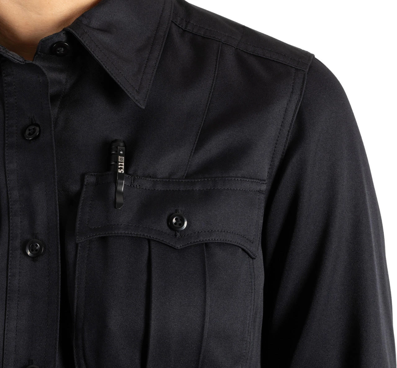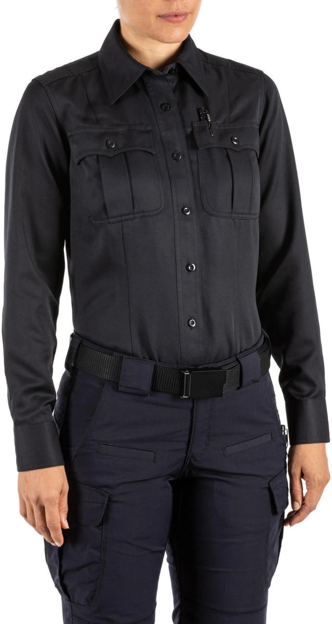 The 5.11 Tactical Women’s Class A Fast-Tac Twill Long Sleeve Uniform Shirt 62396 is a lightweight, water-resistant Class A Fast-Tac Twill, equipped for duty, with mic loop openings on the side seams, dual chest pockets with pen guides, and a center front zip closure. It also comes with everything you need to do your job: Epaulettes, badge tab, camera/radio loop, and a name badge support strip. The stitched creases help you maintain a professional look, no matter what your time at the station or on the street entails.