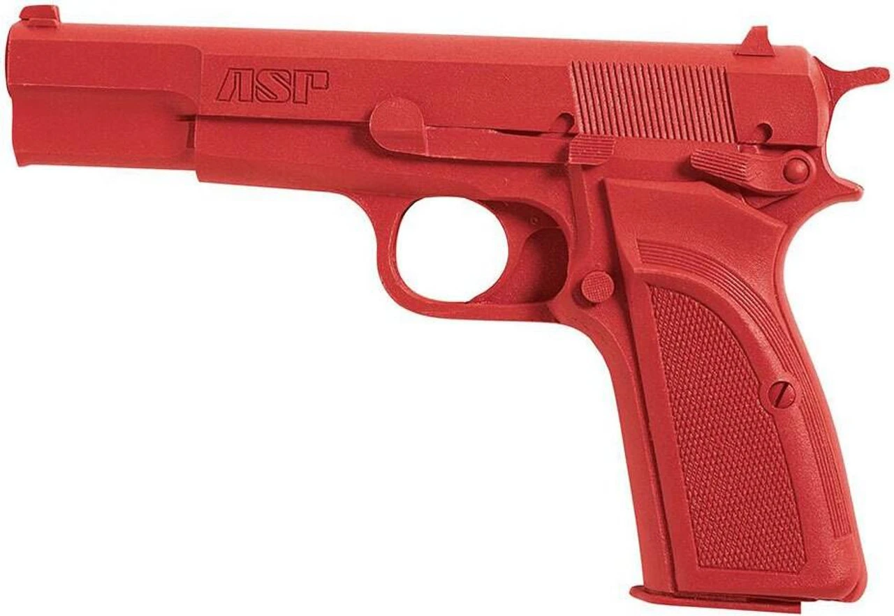 Browning High Power Red Gun is the use of real weapons during training classes has resulted in far too many law enforcement students and instructors being seriously injured with unloaded firearms and safe knives. ASP red guns provide realistic training replicas of actual law enforcement equipment. They are reinforced, have the durability necessary for continuous training use. Precision molded red guns fit high security law enforcement duty holsters. It provide a safe means of training law enforcement personnel to handle, transport, retain and present firearms. In every significant training detail, red guns replicate the exact appearance and handling characteristics of duty firearms. The distinctive molded-in color of red guns readily identifies them as safe to the public and in the training environment.