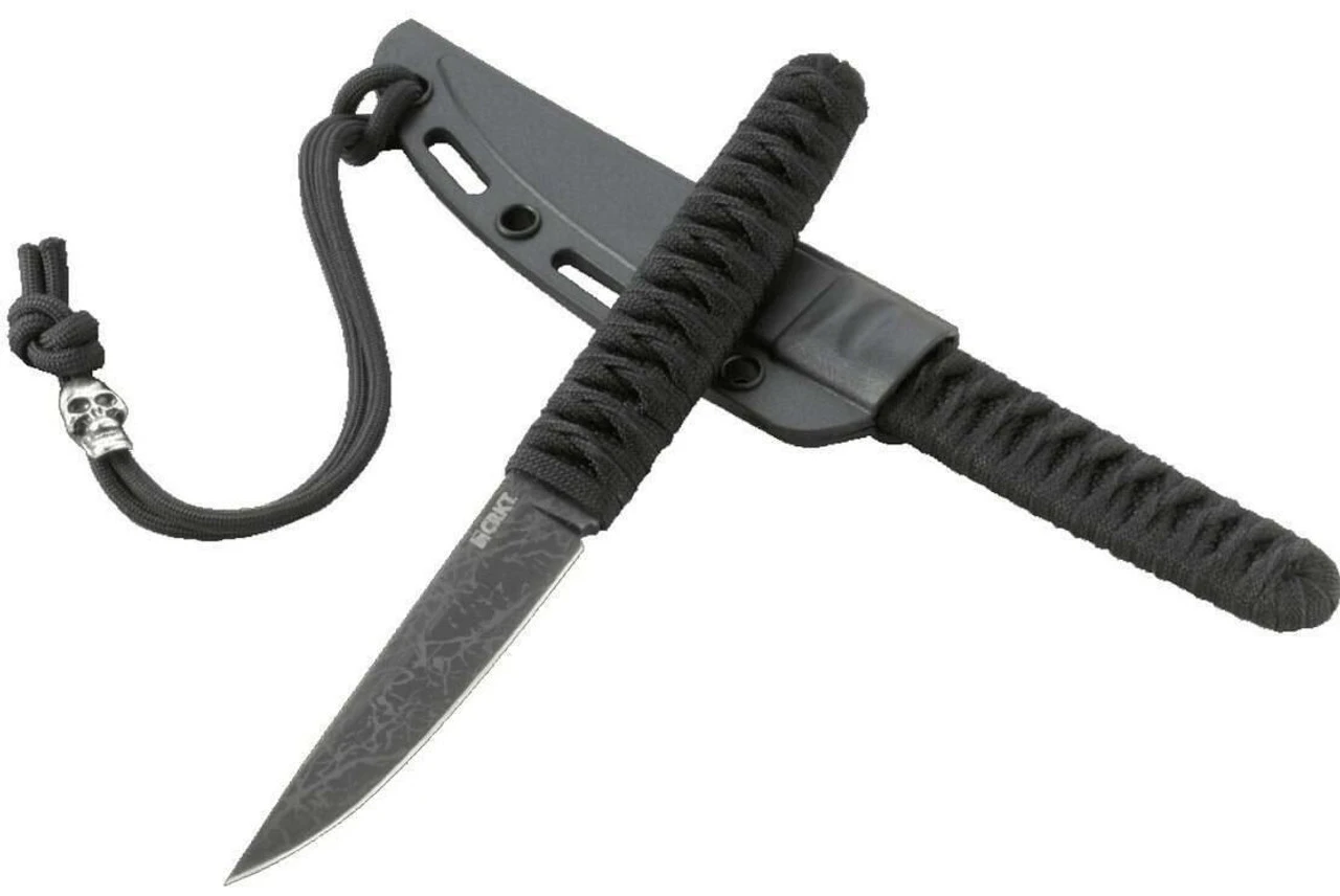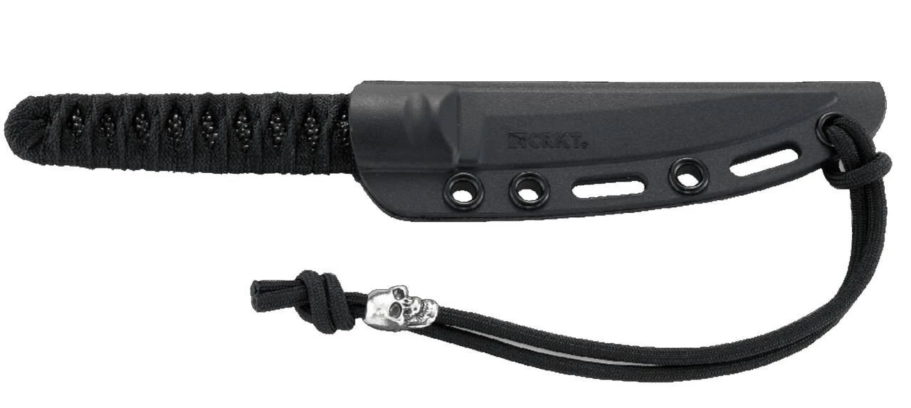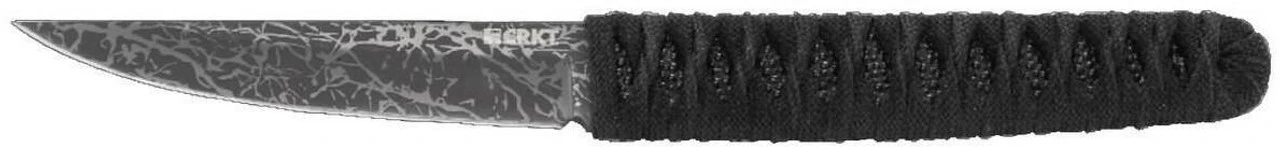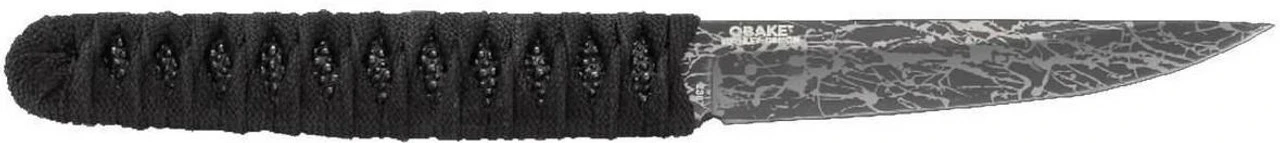 The CRKT Obake Knife features a uniquely etched blade and cord wrapped ray-skin style handle for a classical knife style built with modern-day materials and techniques. This knife is a tribute to a classic Japanese Kwaiken design, featuring a full tang fixed blade with a unique gray titanium nitride finish that’s acid-etched to make each knife unique. The sheath of the Obake is made from glass-reinforced nylon that provides consistent retention even in humid environments. A paracord lanyard on the sheath is designed to attach to your belt loop and keep the sheath in place when you deploy the knife. A skull bead adds a not-so-subtle accent to the paracord lanyard. The handle features a Katana style nylon cord wrap over a black faux ray-skin for an exceptional and secure all-weather grip.