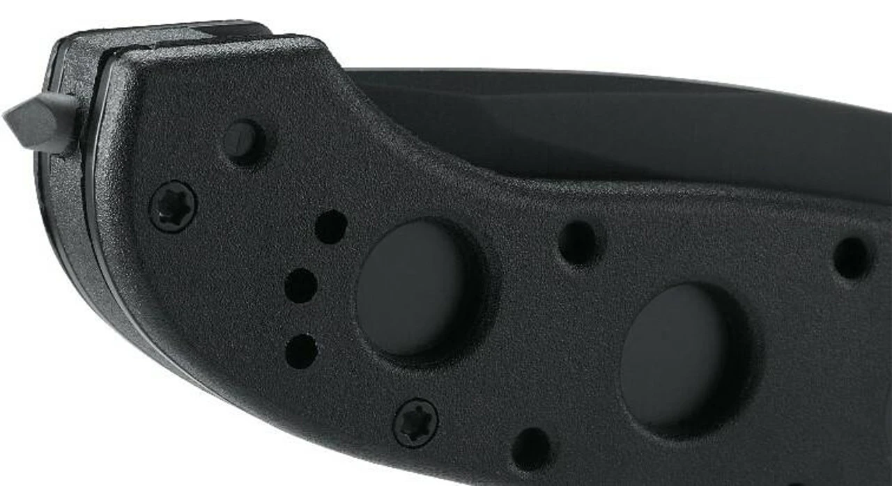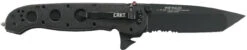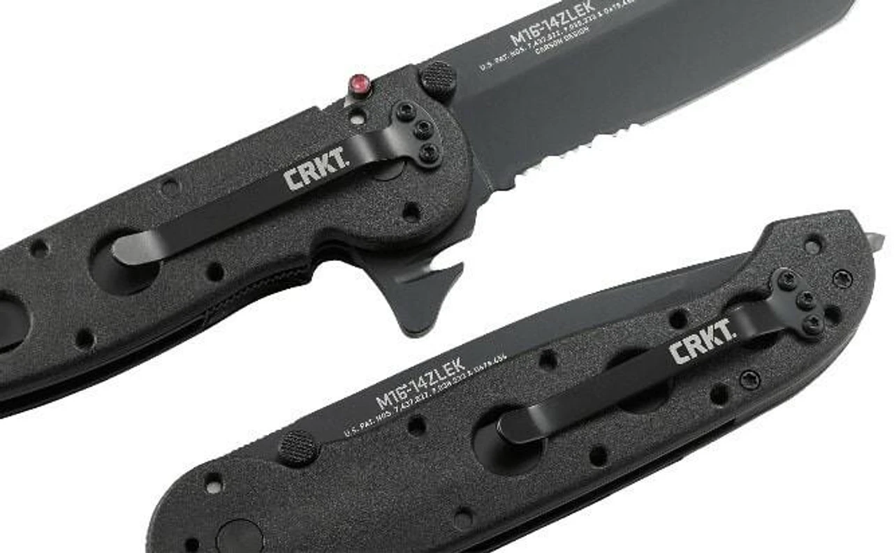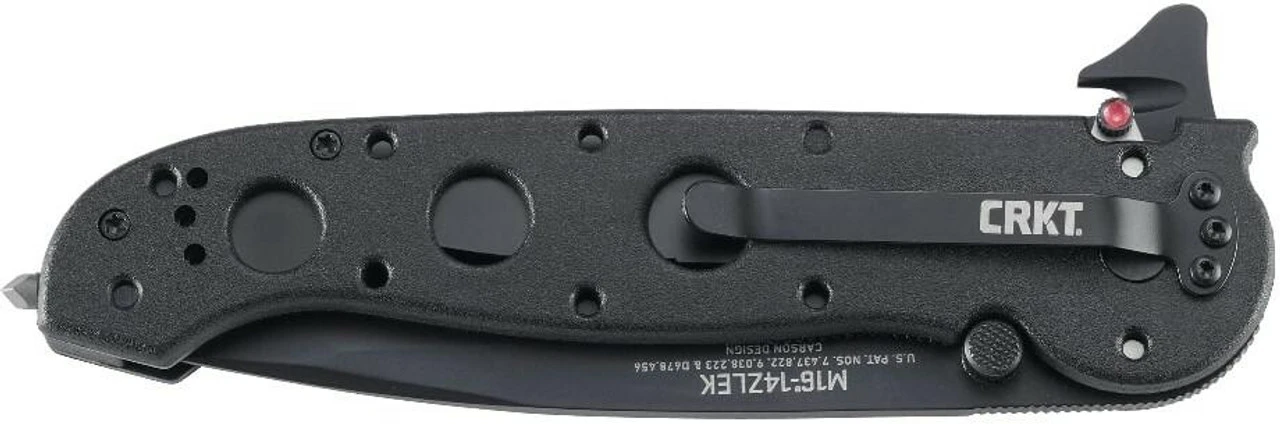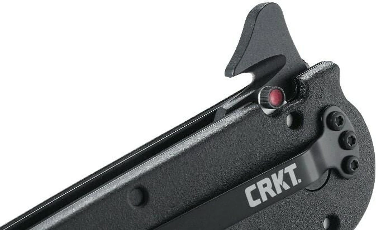 The CRKT M16 Tanto Blade Knife features an InterFrame construction, with tough, textured glass filled nylon scales over a 420J2 stainless steel liner InterFrame and solid glass filled nylon back spacers. The Flipper can be pressed for fast one-hand opening and creates a blade guard when open. At the butt of the knife is a seat belt cutter to the Carson Flipper, and a tungsten carbide window breaker that shatters automobile side windows with one quick whack from the butt of the knife. The premium AUS 8 high-carbon stainless steel for the blades, which have Combined Razor-Sharp and Triple-Point Serrated edges to easily cut rope, cord, canvas, and vegetation. The automated liner safety sets a pin between the locking liner and the frame for an additional layer of safety, so the locking liner is less likely to disengage during use. To close the knife, pull the red buttoned safety lever back, slide the locking liner over, and fold the blade into the closed position.