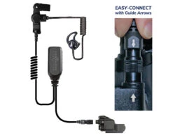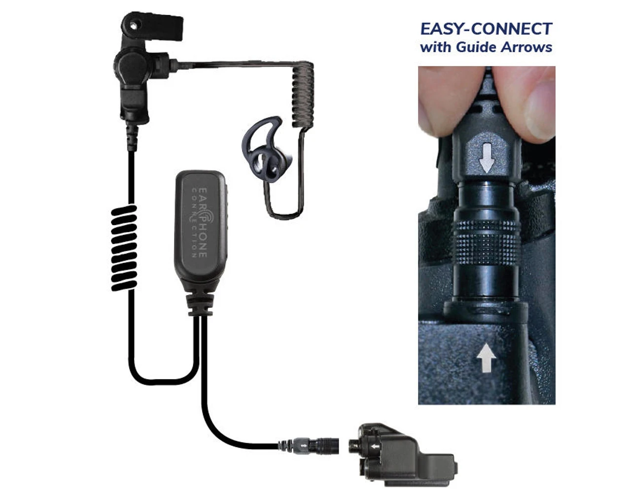 The Hawk EC Lapel Microphone features the Easy-Connect system with Guide Arrows for many radio makes and models. The new design features 2 Guide Arrows: One is located on the strain relief cable connector portion of your Hawk EC Lapel Microphone and the other is located on the EC Easy-Connect adapter. This new upgrade ensures that radio connection is immediate and secure.