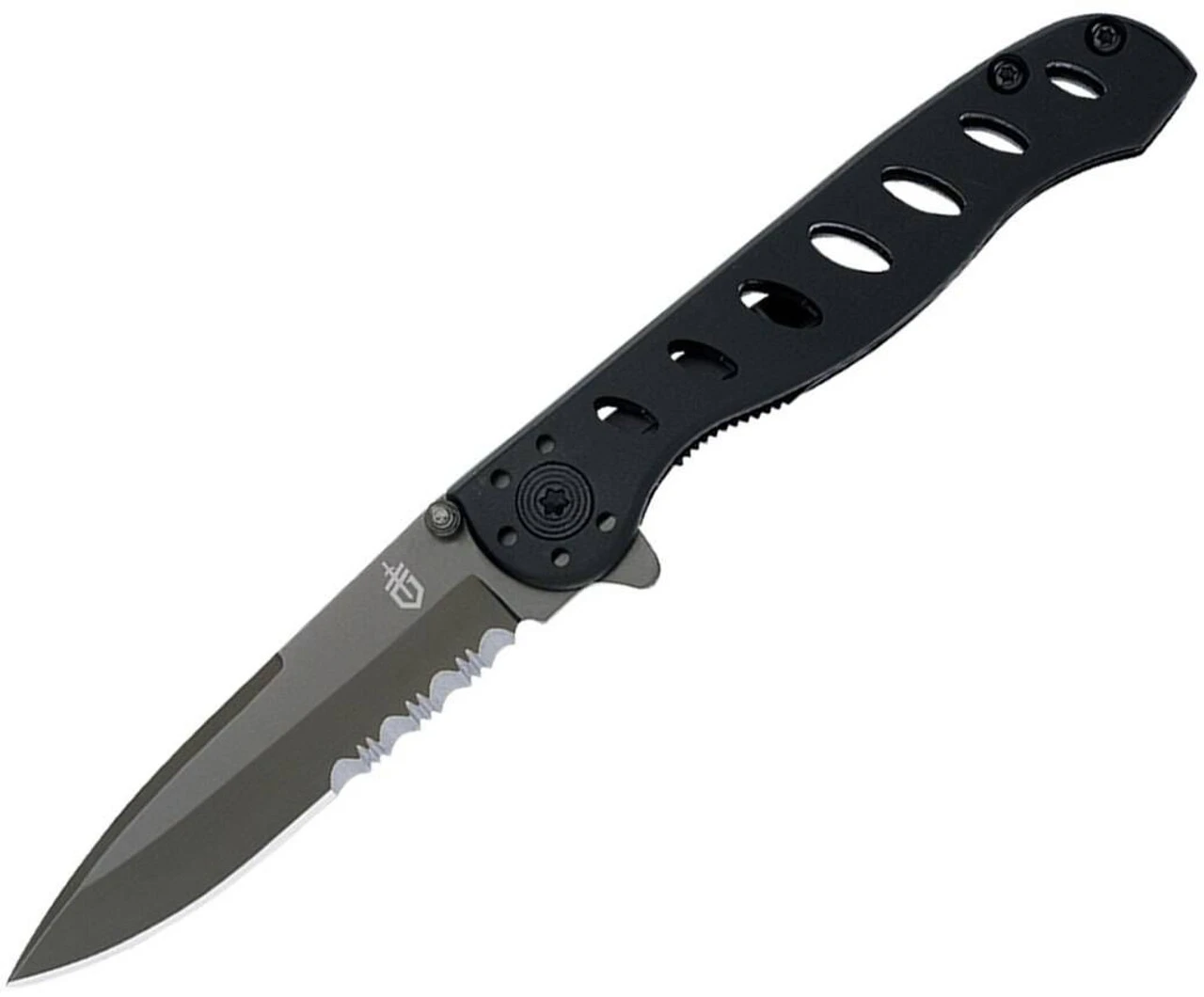 The Gerber EVO JR. Folding Knife is one of the lightest knives that Gerber makes, thanks to the multiple openings in the anodized aluminum handle. The serrated edge blade is made of 7Cr17MoV steel to aid in corrosion resistance. The thumbstud and finger flipper allow for true one-handed opening and engagement.