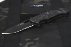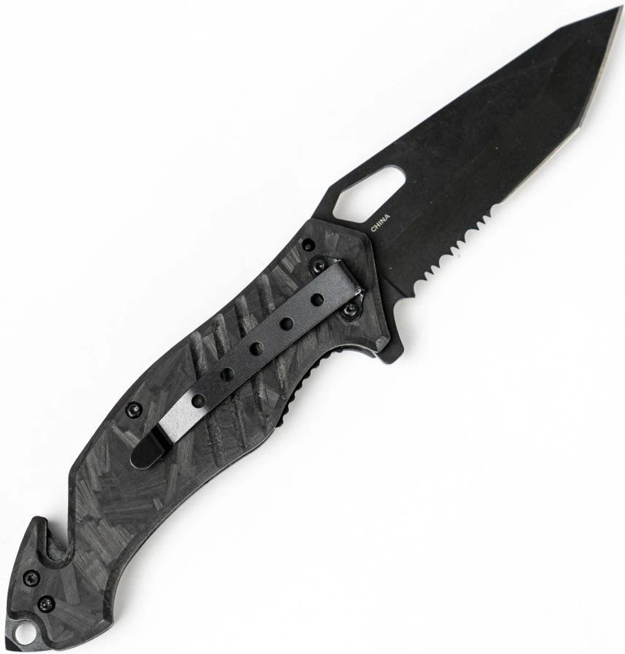 The Rescue EDC Folding Knife has a liner lock mechanism, and features an assisted opening tanto blade, which can be opened ambidextrously with the thumb opening or with the finger tab. The rear of this knife features a built in seatbelt cutter and a glass breaker. The glow-in-the-dark handle must be “charged up” by placing the knife in sunlight, general lighting, or ambient stray light.