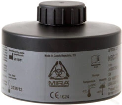 The MIRA Safety NBC-77 SOF Gas Mask Filter in combination with a full-face respirator, mouthpiece assembly, or PAPR, reliably protects air passages from a wide range of harmful and highly toxic substances, including all known chemical, biological, radiological, and nuclear (CBRN) agents