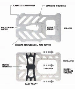 - Includes: Cash Wrap Strap, bottle opener, 5 standard-size wrenches, 6 metric-size wrenches, nail-removing knotch, phillips screwdriver, flathead screwdriver, scraper, metric and standard rulers, & protractor
