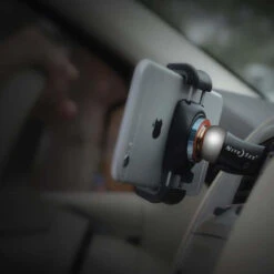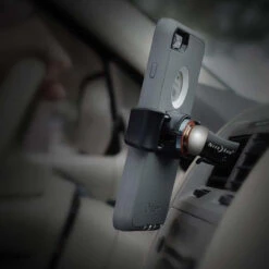 The Nite Ize Steelie FreeMount Vent Kit works with most types of vehicle vents and most any phone on the market. Phones stay gripped securely in the adjustable FreeMount, which then connect magnetically to the Vent Mount. The FreeMount arms can be adjusted to hold phones in place with a firm squeeze, and the release button on the back makes it easy to remove your phone with a smooth one-handed motion. The Vent Mount is a portable solution that can be moved easily from car to car by simply unsnapping the strong cam locking lever, then clicking it back in place on the next vehicle vent. The round shape of the ball on the Vent Mount allows the FreeMount to smoothly articulate for endless viewing angles. As an added bonus, when the FreeMount is on your phone, it allows it to connect magnetically to other convenient surfaces like your refrigerator or tool box.