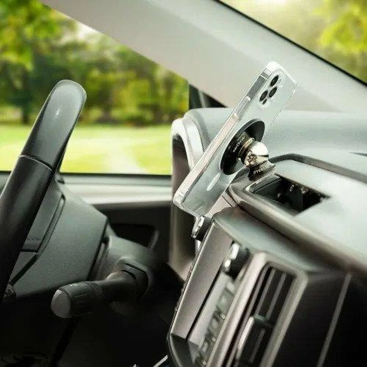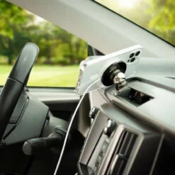 The Nite Ize Steelie Orbiter Plus Dash Kit includes an Orbiter Plus Magnetic Socket, Dash Mount, and Metal Ring to keep your phone securely in view during morning commutes, road trips and busy errands. The Orbiter Plus Magnetic Socket features a powerful neodymium magnet and silicone center that is designed to align with the magnets inside MagSafe iPhones, cases, and chargers. The Orbiter Plus Magnetic Socket can be connected to the Steelie Dash Mount, which features a smooth steel ball to provide unlimited viewing angles and secures to your dash with included 3M VHB adhesive. The adhesive-backed Metal Ring sticks to the back of your Apple MagSafe charger, allowing your phone to stay magnetically mounted while charging.