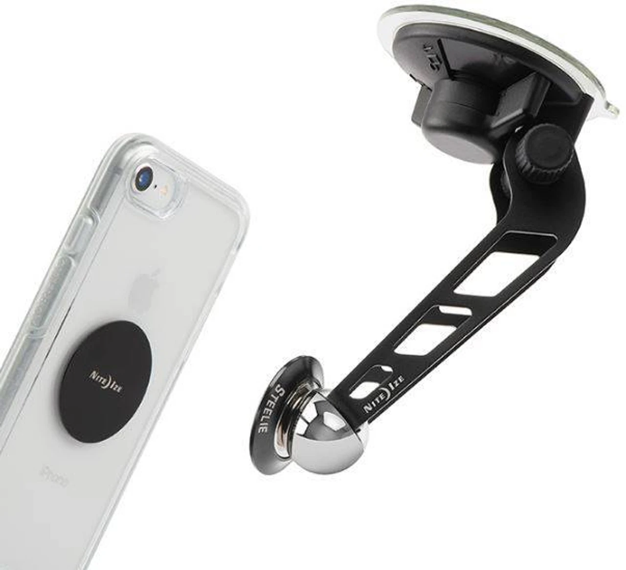 The Nite Ize Steelie Orbiter Windshield Kit combines the portable Windshield Mount with the powerful Orbiter Magnetic Socket to keep your phone secure and conveniently accessible. The Windshield Mount features an adjustable aluminum arm and suspended Steelie ball, which can be adjusted for the perfect viewing angle. The patented suction cup design features an easy-to-use locking lever for ultimate holding power to your windshield. It also acts as a quick release lever when you want to remove it, making it perfect for multiple cars or to take with you while traveling. The Orbiter Magnetic Socket attaches to the Windshield Mount using a powerful neodymium magnet and silicone center for a secure connection and smooth glide. By combining magnetic power and a thin high-friction ring designed to prevent slipping, the phone docking surface of the Orbiter Magnetic Socket holds your phone securely in place. Simply adhere the low-profile metal plate to your phone or case and you’re ready to quickly attach, detach, and rotate your phone for quick and easy handsfree viewing wherever you go.