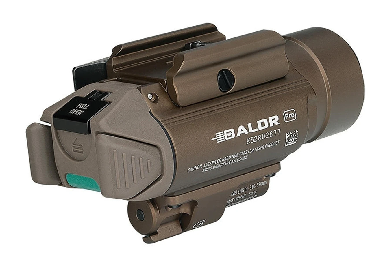 The Olight Baldr Pro Green Laser Tactical Flashlight is a professional lighting tool with green laser sight and white LED for installation on equipment. Powered by two CR123A batteries, the max output of the Baldr Pro is 1350 lumens.