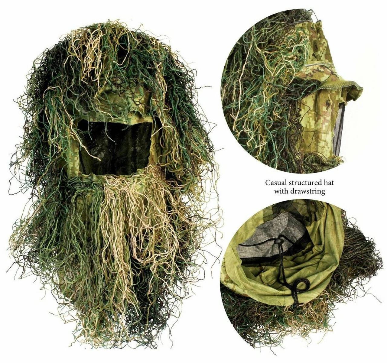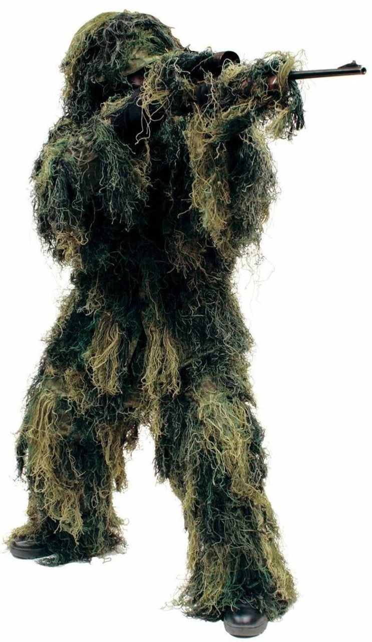 The Red Rock Outdoor Gear 5-Piece Adult Ghillie Suit offers superior comfort and convenience and is designed to go on quickly over clothing and allow direct access to pockets underneath making it ideal for layering. The dense ghillie material provides effective camouflage in a lightweight package which is suitable for hunting in numerous environments. The pants have an elastic waist and a drawstring to offer a comfortable, custom fit. To go on easily over boots, the pants have snap closures on the outer seam near the ankle. A drawstring-equipped hood covers the entire head and neck. The gun wrap has elastic and a drawstring which allows it to cover an average size shotgun or rifle. The entire ghillie suit fits into the included stuff sack.