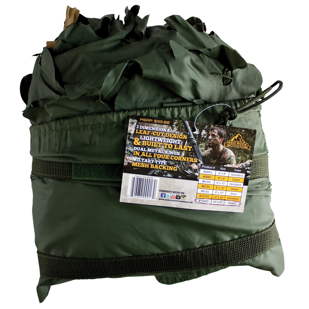 The Red Rock Camouflage Hunting Series Netting is a lightweight and versatile camouflage netting with a military-style mesh backing with reinforced edges for an easy to carry and deploy net that is built to last. A stuff sack is included for storage and transportation. The three-dimensional leaf-cut design provides superior concealment with a full, natural look. The two metal rings sewn into each corner make hanging and securing this net a simple task.Â