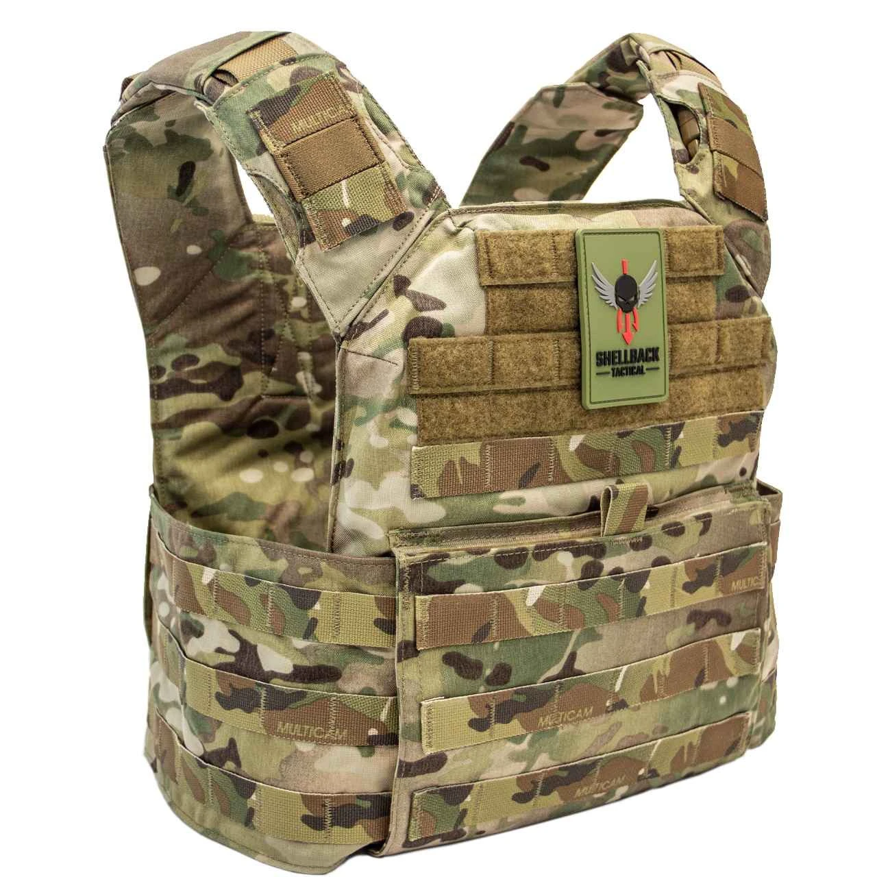 Featuring fully adjustable and padded shoulders, which once adjusted, slides into itself and locks in securely with a hidden quick release buckle. The shoulders have 2 rows of PALS webbing with elastic nylon sewn in between the PALS webbing allowing for comms or hydration tubing. The front and back feature 5 rows of PALS webbing and two 2 inch rows of Loop sewn on for identifiers such as flags and patches. The front and back of the panels of the carrier on the body side are also padded. Rifle plates are loaded from the bottom front/back and secured with a hook/loop closure.