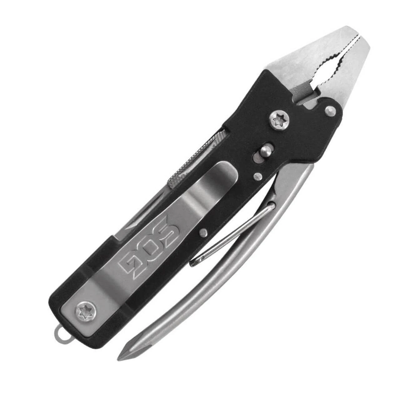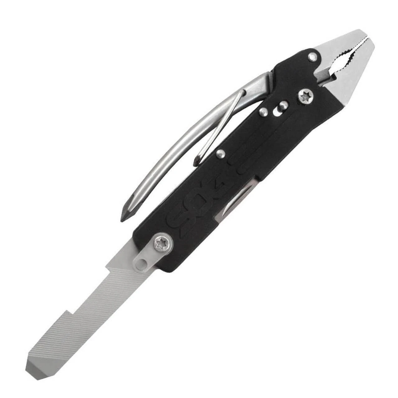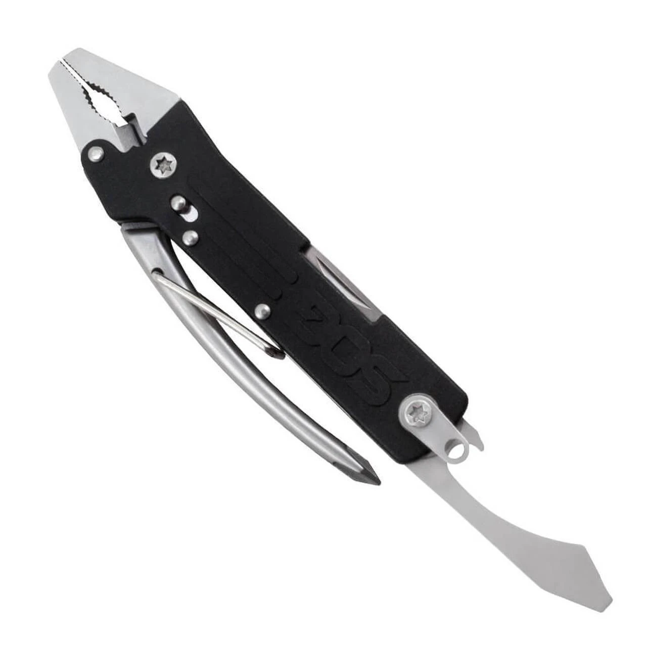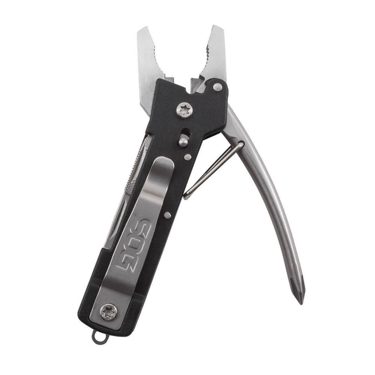 The SOG Micro Tool Clip has the essential everyday tools you need for everything from clipping thin wires, driving screws, opening bottles, and general cutting duties. The spring-loaded pliers on the Micro Toolclip are easy to use and lock closed when not in use. Components include pliers, soft wire cutter, gripper, large flat screwdriver, 2-sided file, small flat screwdriver, bottle opener, straight blade, & Phillips screwdriver all in a tool only 3.9” in length.