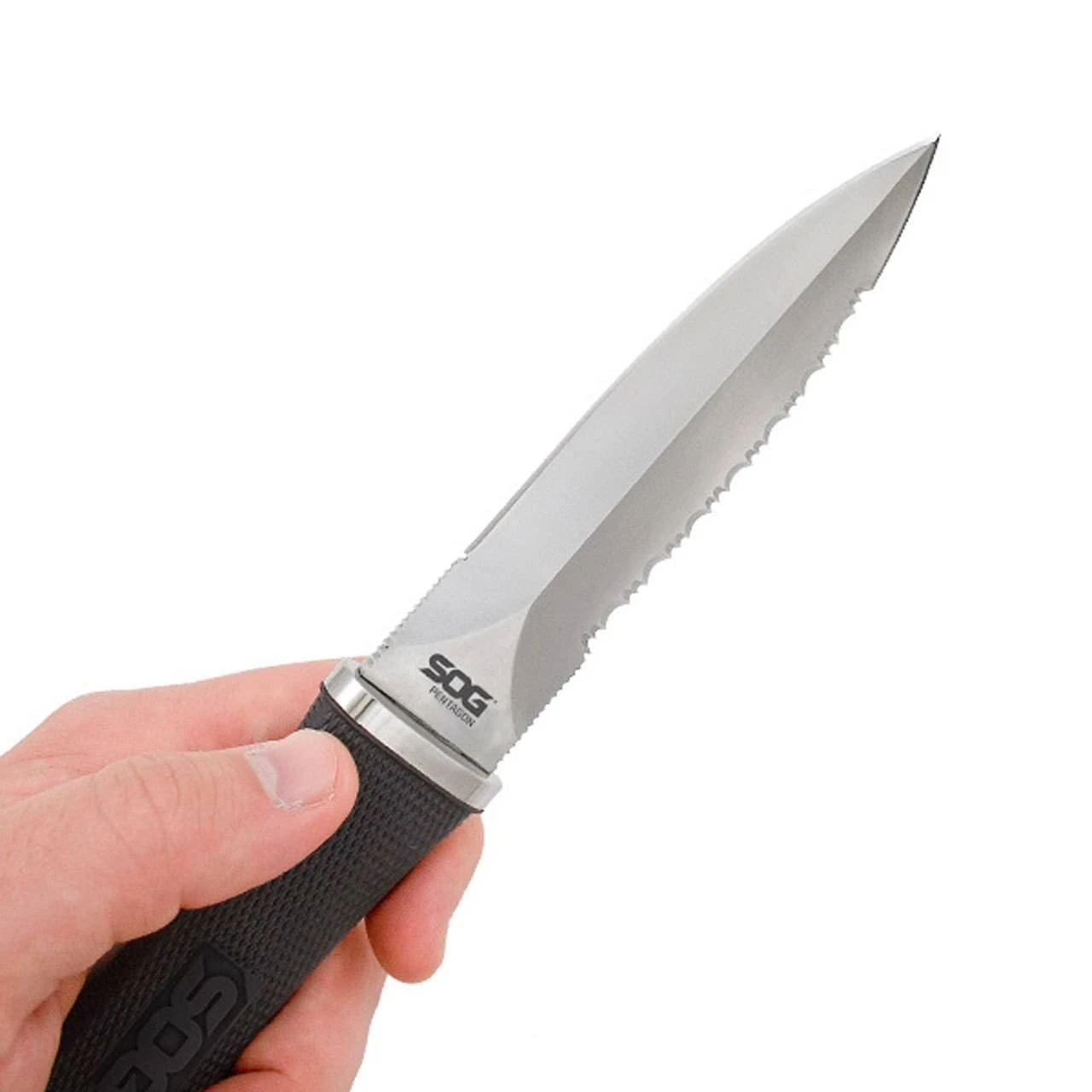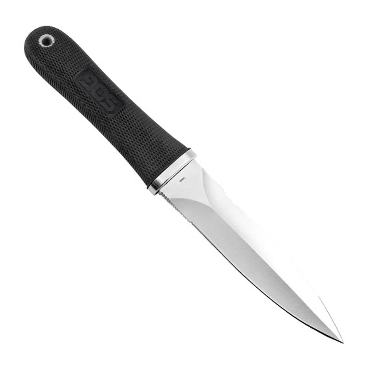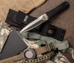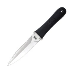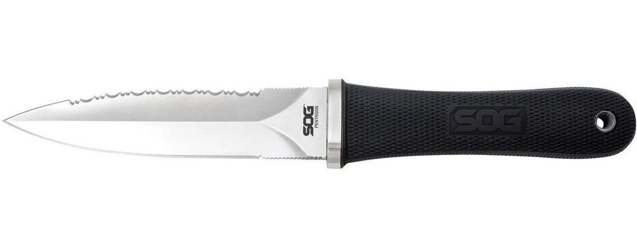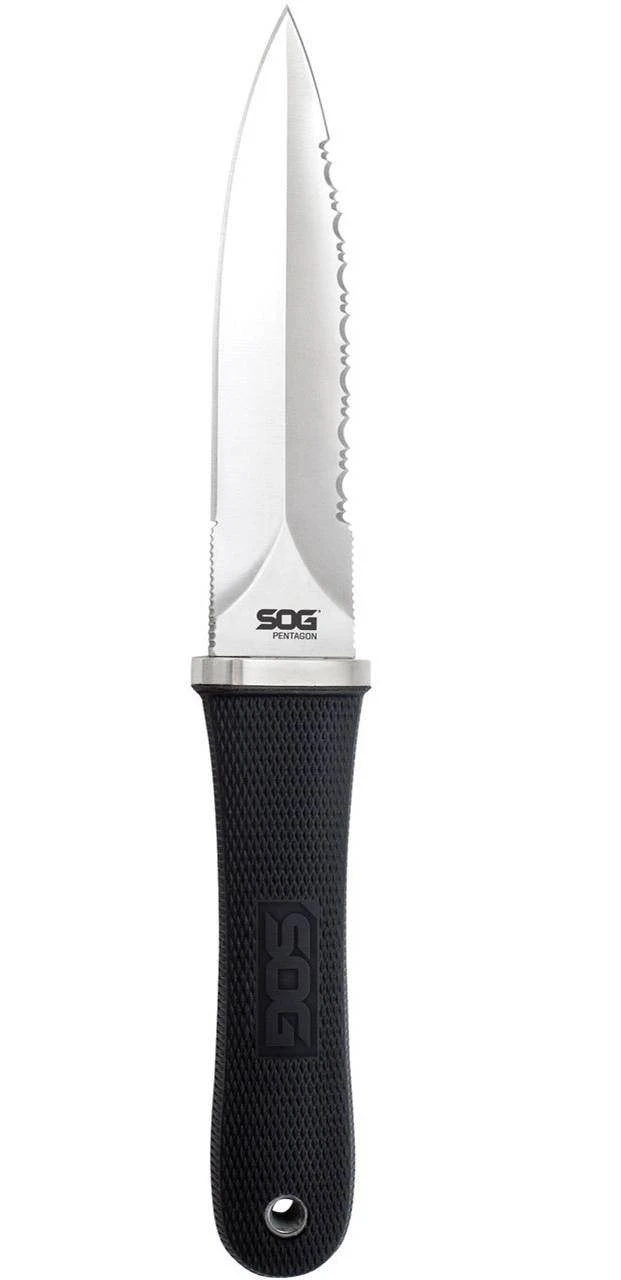 The SOG Pentagon serires was originally designed as back-up for law enforcement and military personnel but is now popular with outdoor knife enthusiasts as well. It offers the instant choice between a serrated or beveled edge for cutting options and twin thumb notches enable accurate blade orientation and downward control. The aggressively checkered, flared handles provide confident gripping, feel and balance. Comes with a tactical nylon sheath.