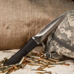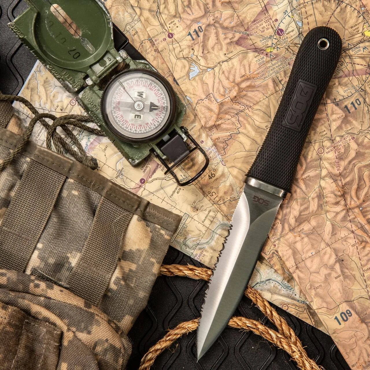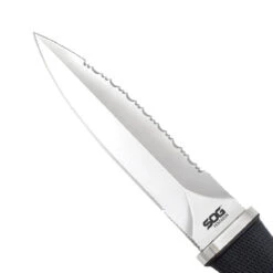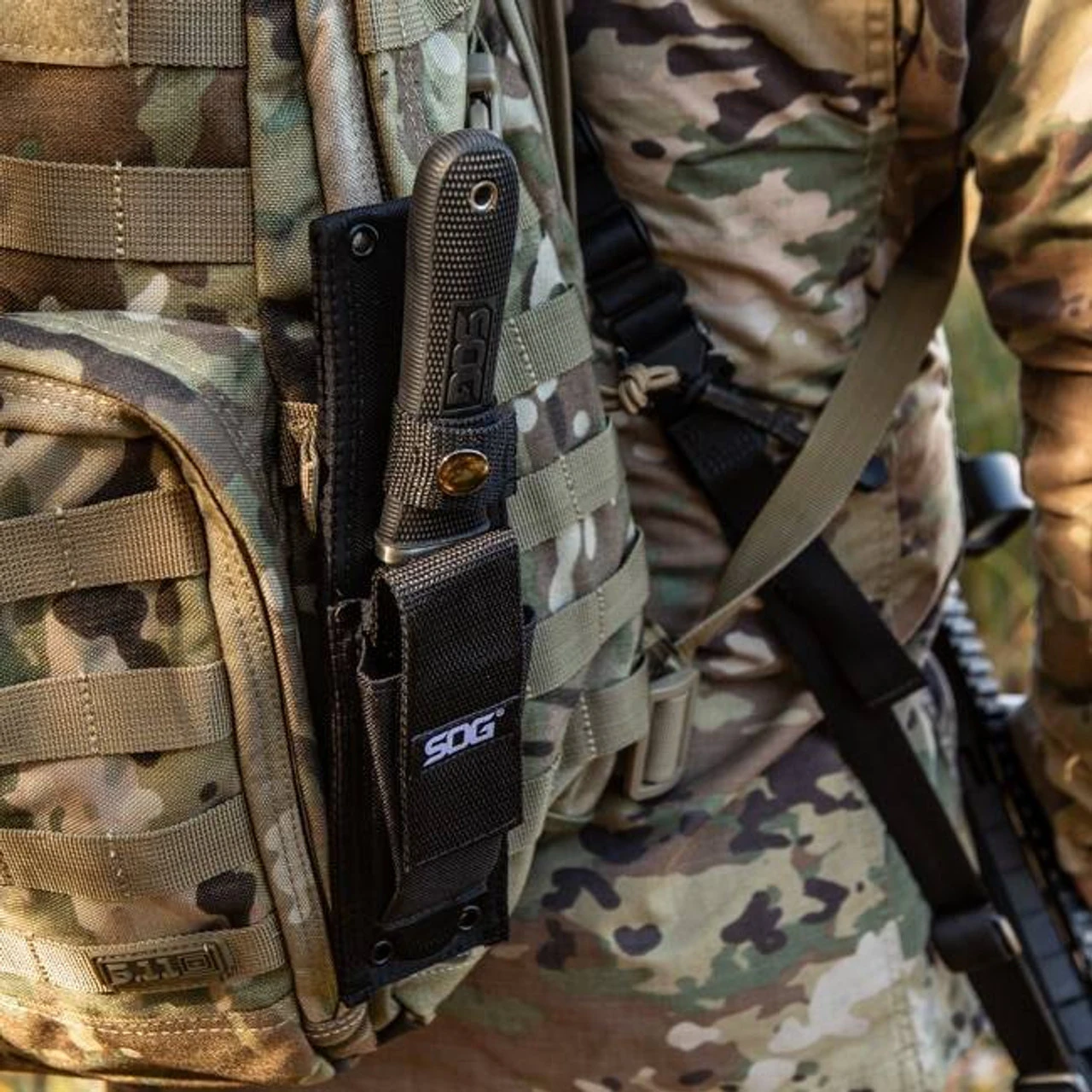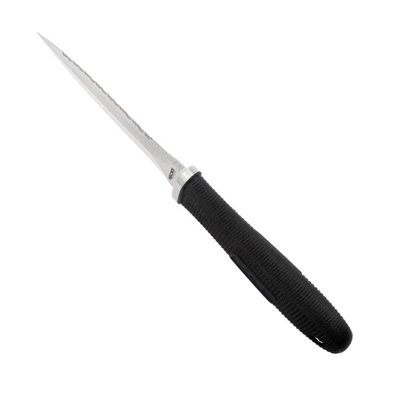 The SOG Pentagon serires was originally designed as back-up for law enforcement and military personnel but is now popular with outdoor knife enthusiasts as well. It offers the instant choice between a serrated or beveled edge for cutting options and twin thumb notches enable accurate blade orientation and downward control. The aggressively checkered, flared handles provide confident gripping, feel and balance. Comes with a tactical nylon sheath.