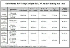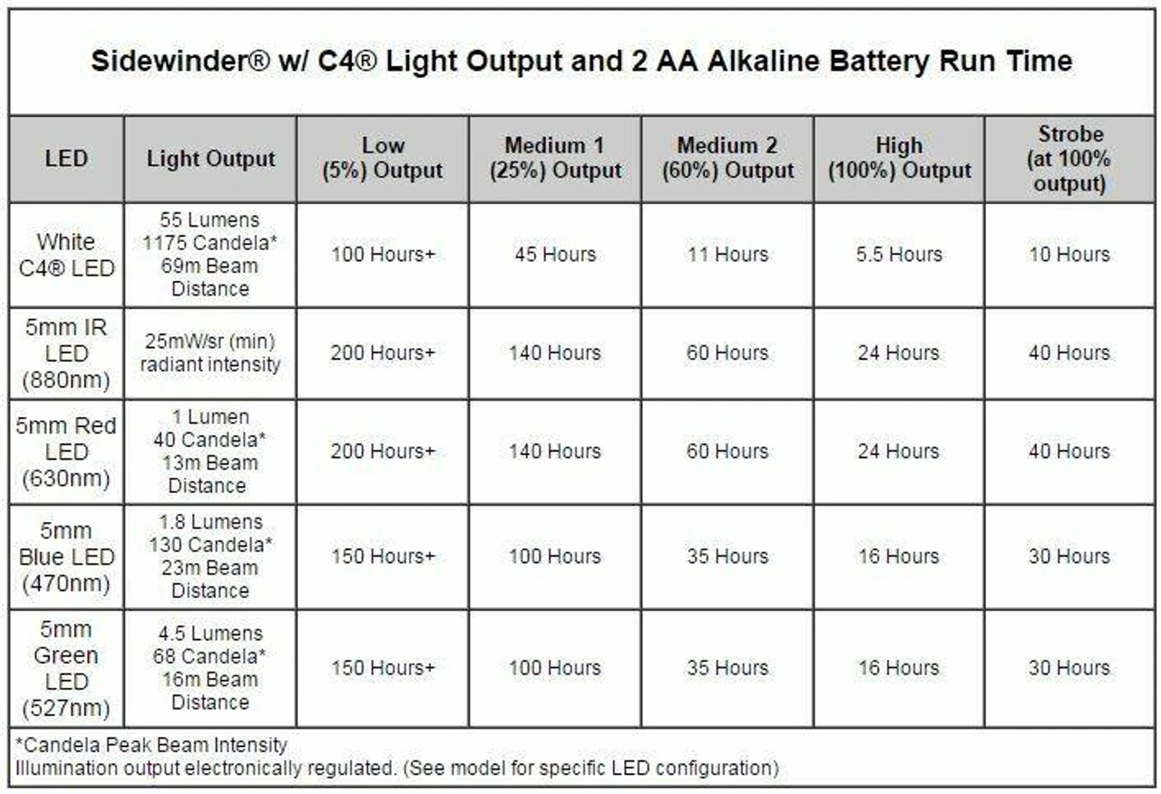 - White C4 LED for bright light: 55 lumens; 1,175 candela; 69m beam distance