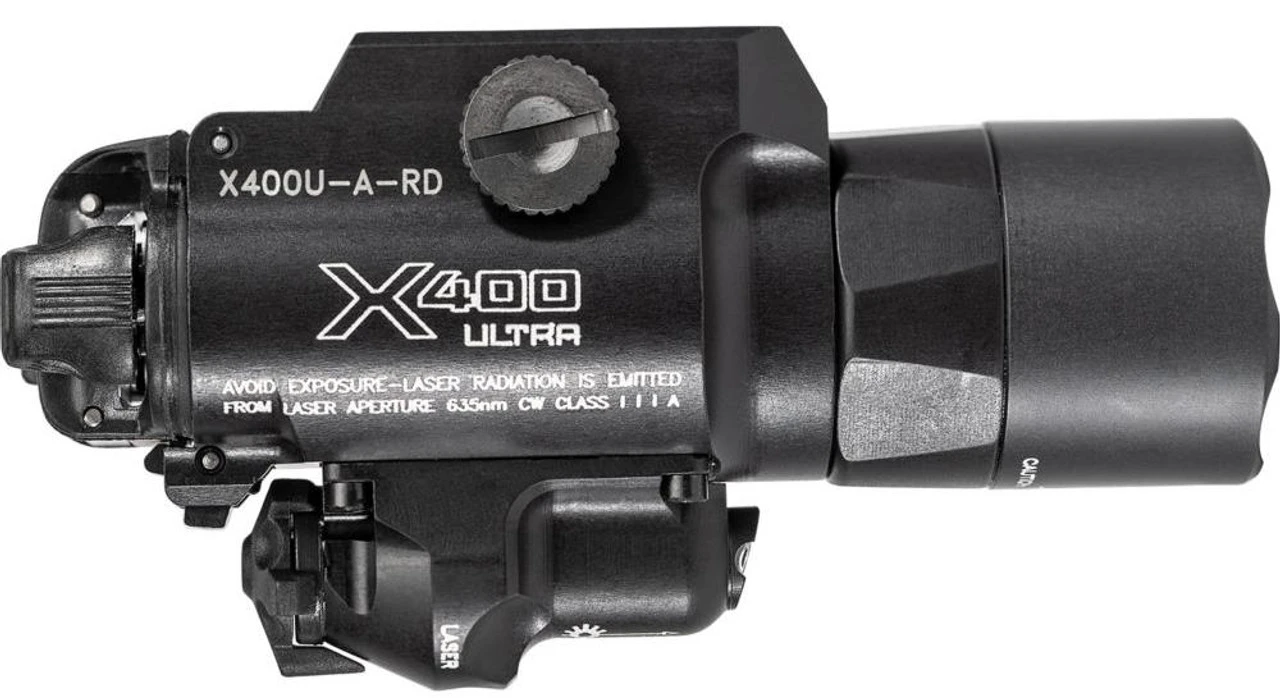 The SureFire X400 Ultra WeaponLight with Red Laser features a recoil-proof LED and TIR lens that focuses 1,000 lumens of light into a smooth, far-reaching beam with a large central spot that is extremely effective for close- to medium-range engagements. The high-strength aerospace aluminum body is Mil-Spec hard anodized for superior toughness and corrosion resistance and is O-ring and gasket sealed to keep out dust and moisture. The X400 Ultra’s 5-milliwatt laser sight, located below the primary light, emits a high-visibility red (635 nM) beam. The laser’s aiming adjustment mechanism uses Nylok screws that won’t back out from the effects of recoil, which means it rarely needs to be re-zeroed. The versatile X400 Ultra can be attached to a pistol or a long gun since its Rail-Lock system permits rapid attachment/detachment from either Universal or Picatinny rails. Its integral ambidextrous push/toggle switch provides one-finger operation for either momentary or constant-on operation.